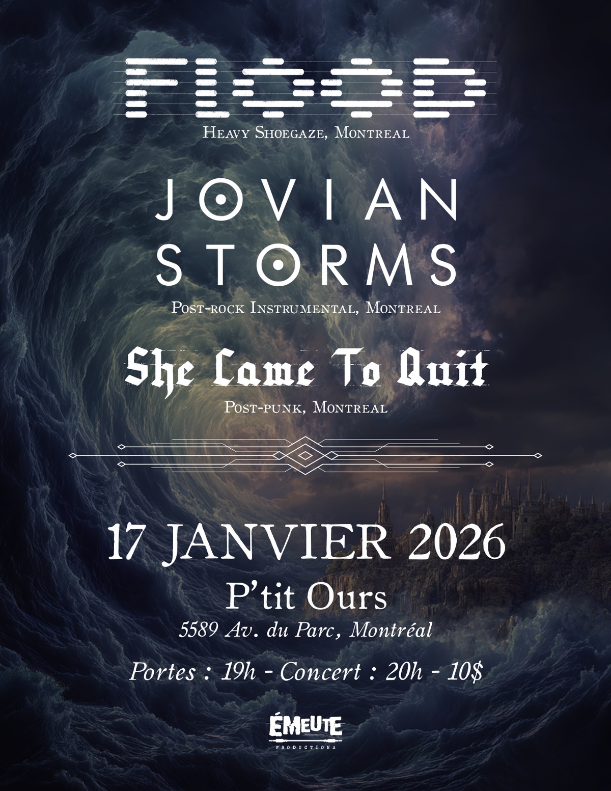 FLOOD + JOVIAN STORMS + SHE CAME TO QUIT @ P'tit Ours